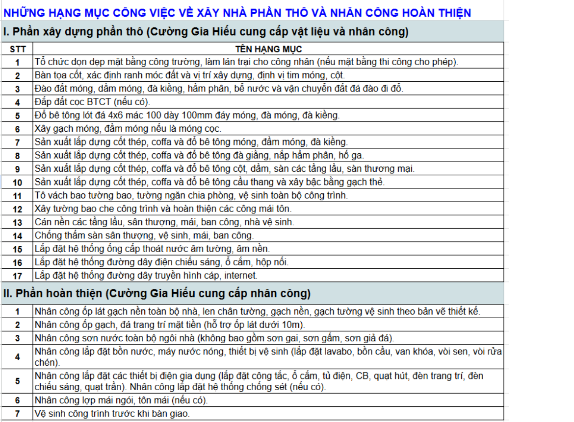 Những hạng mục về xây nhà phần thô và nhân công hoàn thiện.