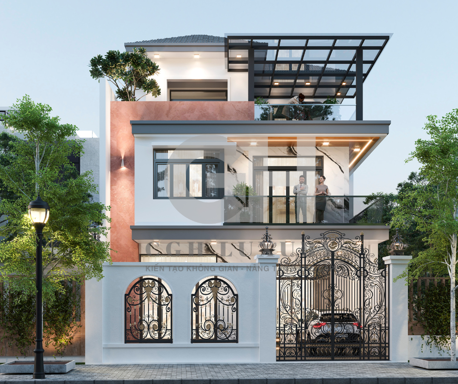 Tổng thể ngôi nhà được xây dựng với tông màu trắng chủ đạo, làm nổi bật các chi tiết phào chỉ và hoa văn trang trí tinh xảo. Cổng chính và hàng rào được thiết kế cầu kỳ, không chỉ đảm bảo an ninh mà còn làm tăng thêm vẻ kiêu sa, lộng lẫy cho toàn bộ công trình.