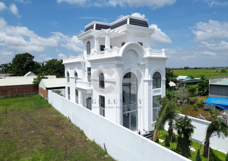Tổng thể ngôi nhà được xây dựng với tông màu trắng chủ đạo, làm nổi bật các chi tiết phào chỉ và hoa văn trang trí tinh xảo. Cổng chính và hàng rào được thiết kế cầu kỳ, không chỉ đảm bảo an ninh mà còn làm tăng thêm vẻ kiêu sa, lộng lẫy cho toàn bộ công trình
